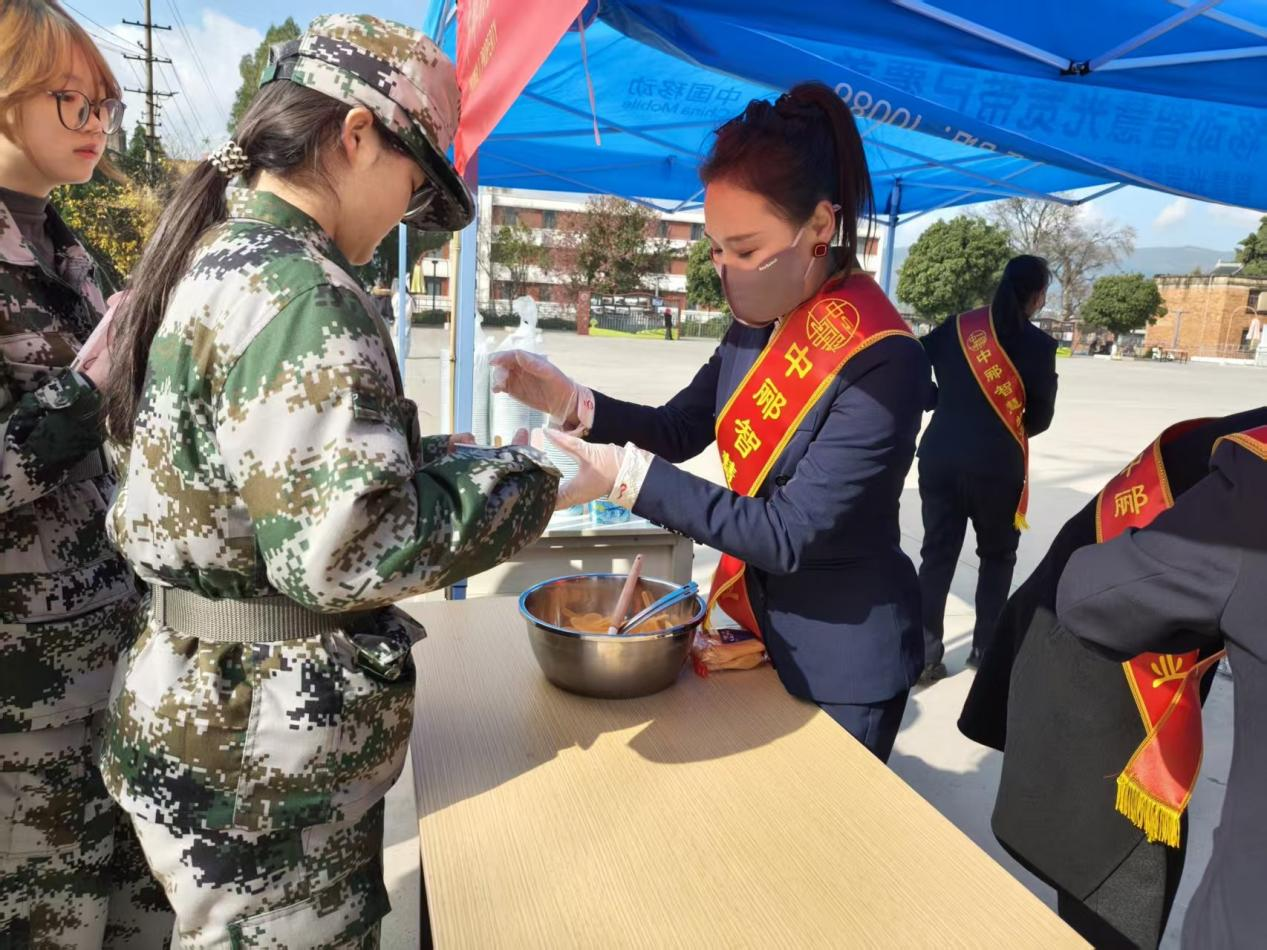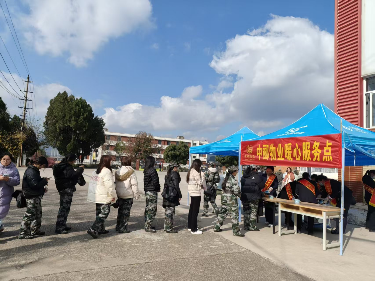 军训期间,同学们不惧寒冷、坚持训练。为让学生们在训练之余感受到学校的关怀,中郦物业工作人员提前准备,精心熬制红糖姜汤、煮制手工汤圆,在宿舍门口将一份份热气腾腾的汤圆和姜汤递到同学们手中。