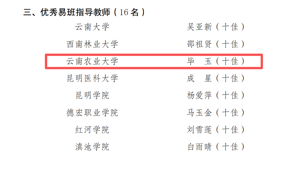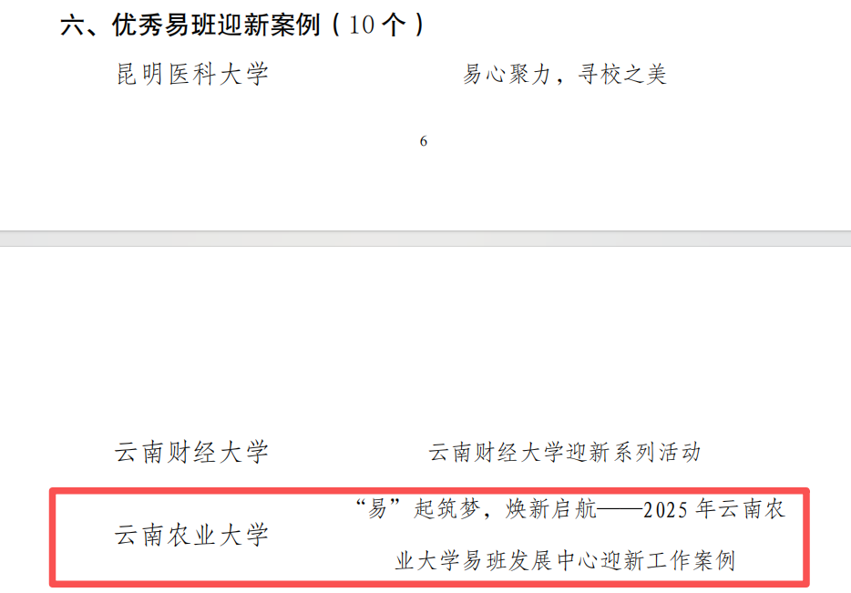 在 2025 年度评选中,我校成功入选优秀易班共建高校,学校申报的 “易” 起筑梦,焕新启航 ——2025 年云南农业大学易班发展中心迎新工作案例获评优秀易班迎新案例,两大集体荣誉是对我校易班整体建设工作的又一次高度肯定。同时,毕玉老师获评云南省十佳易班指导教师,高畅同学当选云南省十佳易班工作站站长(限报4项,获评4项),多名师生凭借专业能力和用心付出,在全省易班工作者中脱颖而出。